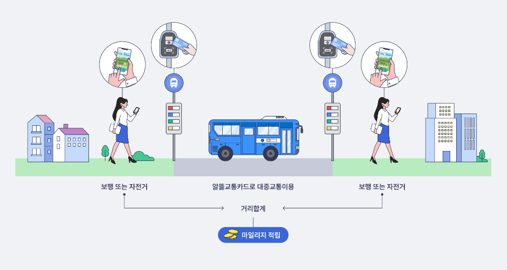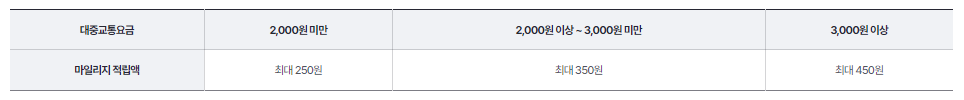 보통의 직장인이 출퇴근을 하면서 10분정도 걸으면서 2,500원정도(출/퇴근 버스비용 기준) 사용한다면 최대 350원을 적립하고 약 7,000원정도 받을 수 있습니다. 물론, 출퇴근을 하지않고 주말에 다른곳으로 이동하는 대중교통 사용시에도 마일리지 적립이 가능합니다.