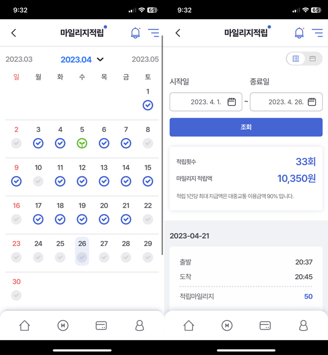 4월 한달동안 사용한 인증입니다. 총 대중교통 이용 요금은 41,250원(1,250원*33회)에 10,350원 마일리지를 쌓았으니 마일리지 적립으로만 약 25%할인을 받았습니다. (앱 데이터 기준 / 오차가 있을 수 있음)