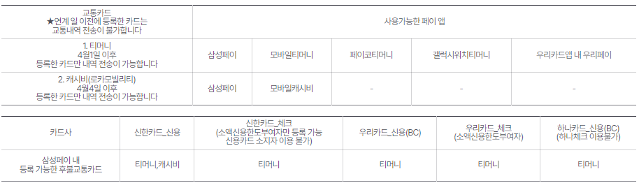 A.4월 1일부터 알뜰교통카드의 신용카드를 모바일페이 앱에서 사용할 수 있다. 애플페이는 아직 지원하지 않습니다.