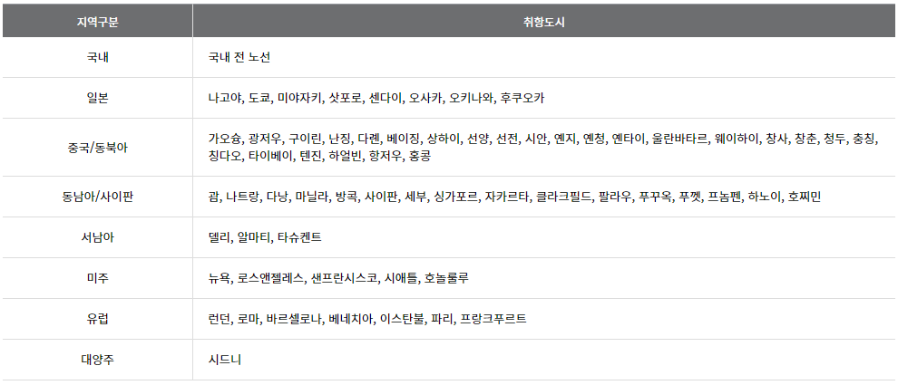 대한항공보다 중국/동북아시아로 갈 수 있는 도시가 많은 반면에 미주나 유럽의 도시들은 마일리로 갈 수 있는 곳이 적어 아쉬운 것 같다.