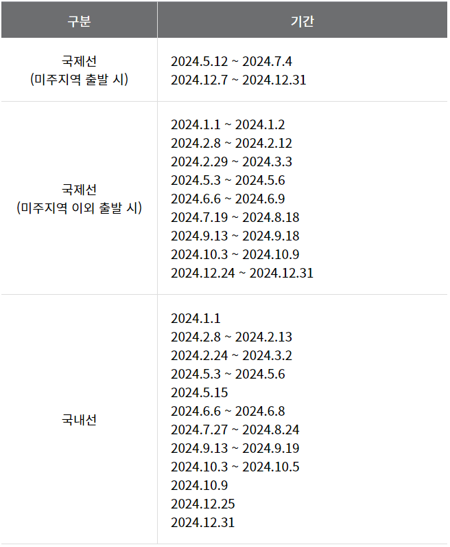 2023년 / 2024년 노선별 성수기 기간입니다.
