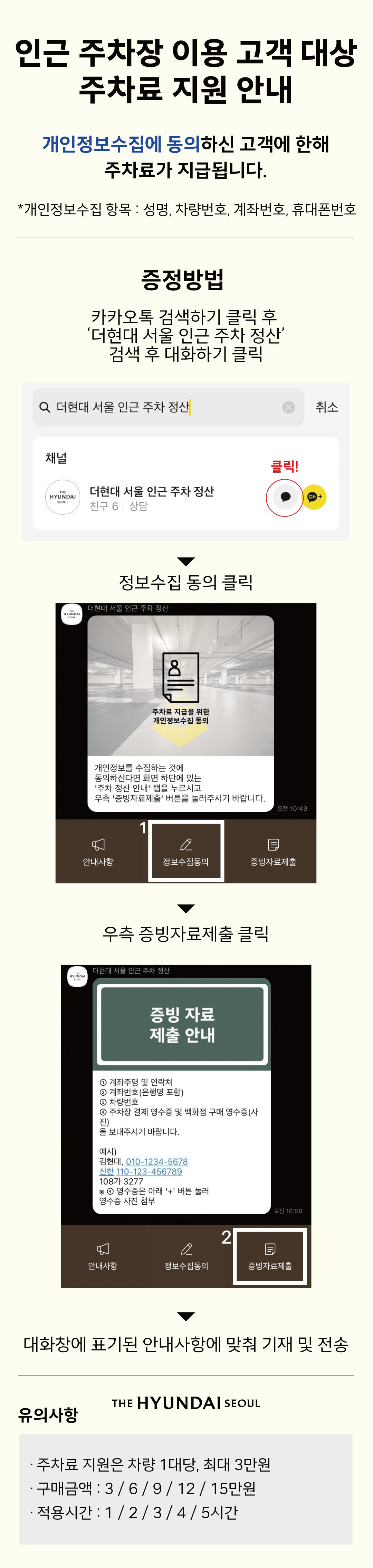 더현대에서는 인근 주차장을 이용한 구매 고객 대상으로 별도 주차료 기준을 적용하여 최대 5시간의 주차료를 지원하는 서비스를 제공하고 있습니다. 단, 주차료 지원은 차량 1대당 최대 3만원까지 지원하고 '더 현대 서울 구매 영수증에 한하여' 해당 서비스는 제공하고 있습니다. 그리고 당연히 외부 주차장 영수증과 백화점 구매 영수증의 결제일은 같아야 합니다.