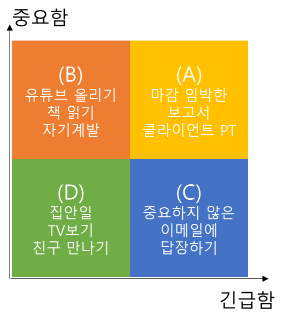 프랭클린 다이어리 계획법의 핵심은 '긴급성'이 아니라, '중요성'이 높은 일이 당신의 인생을 바꾸게 된다는 메세지 입니다. 우리가 다른 사람보다 인생에서 앞서나가기 위해서는 (B)영역에 있는 일들을 필수적으로 해야합니다. 매일 계획을 이런 식으로 세운다면 여러분의 성장은 조금씩이라도 이뤄질 수 있습니다.