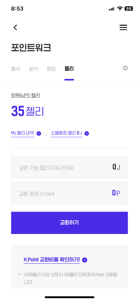 100젤리 단위로 H.POINT 변환은 가능합니다.