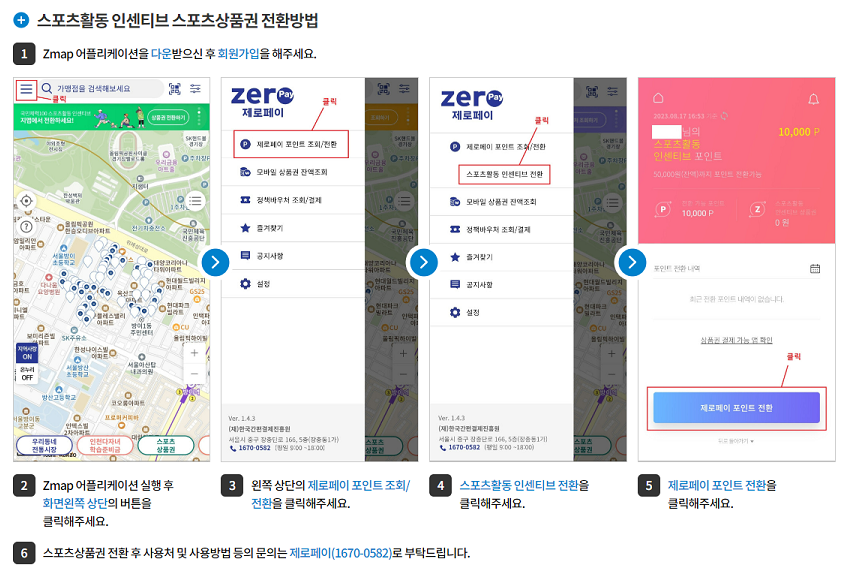 스포츠 상품권 전환 후 사용처 및 사용 방법 등의 문의는 제로페이(1670-0582)로 하시면 된다고 합니다.