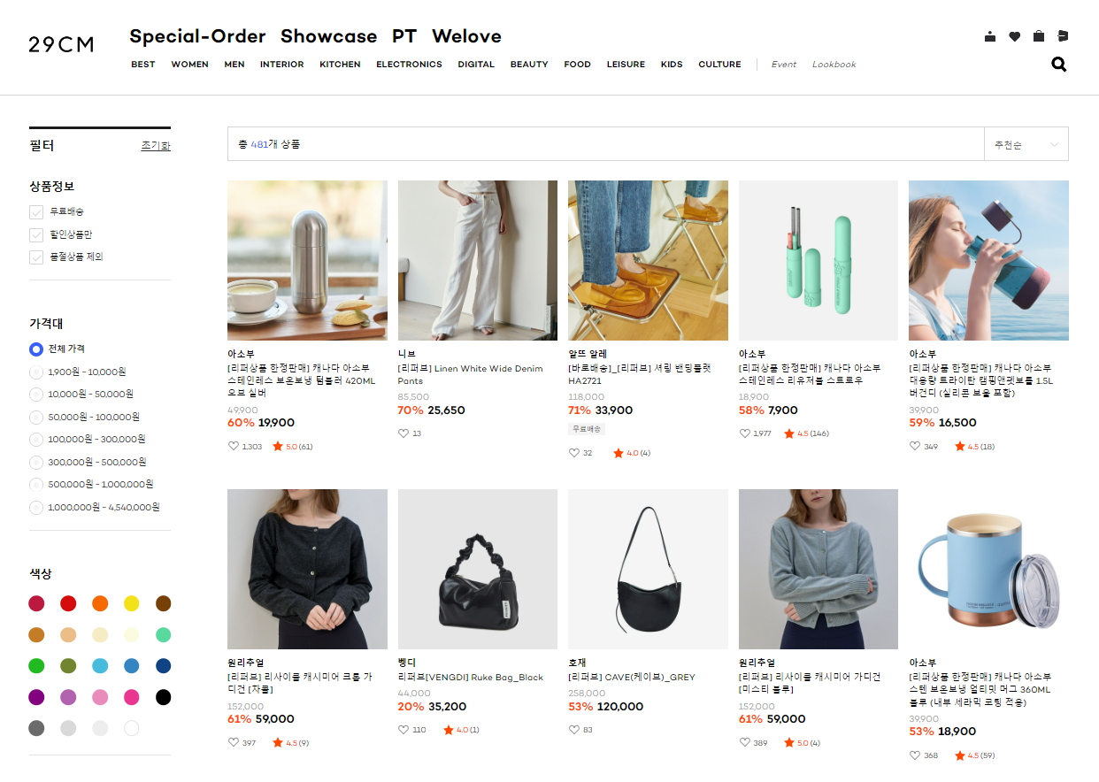 의류, 신발, 텀블러, 가방, 가구, 키친웨어 등 정말 다양한 카테고리가 나옵니다. 평소에 찜해두었던 사항이 없는지도 한번 검색해 보세요. 평소에 구매하고 싶었던 제품을 매우 저렴하게 구매할 수 있습니다.