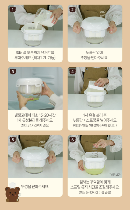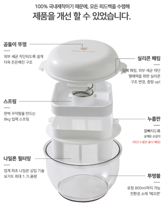 꾸덕메이커는 1차 유청을 분리하고 2차 유청을 분리할 때 누름판과 스프링을 활용해서 한번 더 누르면서 유청이 분리하는 원리입니다. 이때 저의 선택기준은 누름판과 스프링의 구조가 가장 튼튼해 보이는 브랜드인가였습니다. 실제로 사용해 보니 베어그릭스의 스프링은 탄탄하고 2차 유청 분리시에도 굉장히 많은 유청이 나와서 신기하더라구요.