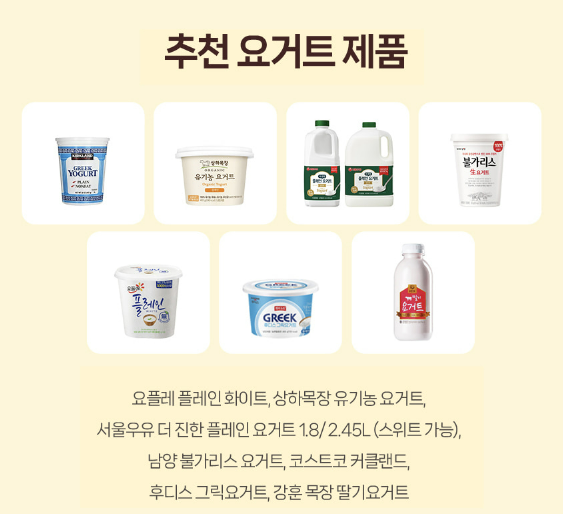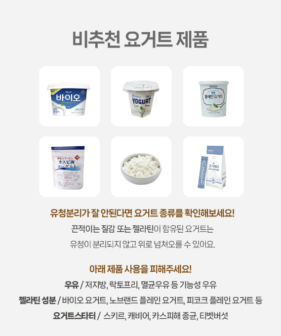 비추천 요거트 제품은 아래와 같습니다. 끈적이는 질감 또는 젤라틴이 함유된 요거트는 유청이 분리되지 않고 위로 넘쳐오를 수 있다고 합니다. 그리고 요거트 스타터 제품이나, 저지방, 락토프리, 멸균 우유 등의 기능성 우유들도 그릭 요거트를 만들 수 없으니 주의하세요.