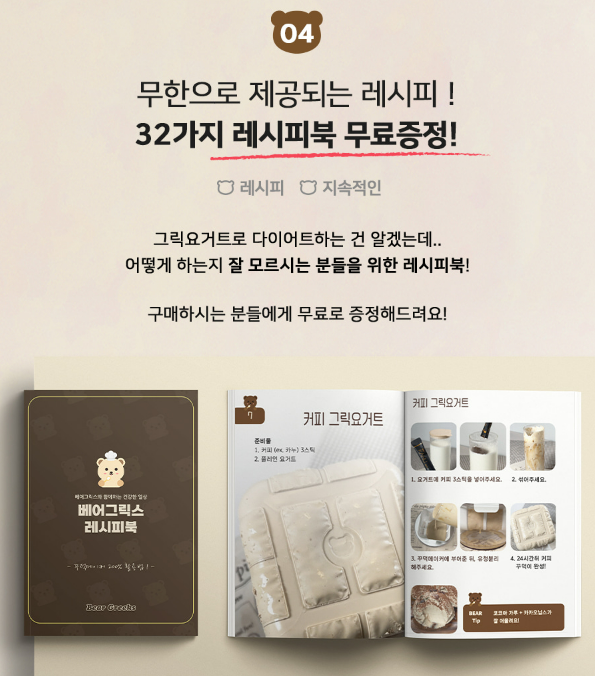 그릭요거트로 무엇을 해먹어야 할지 모르겠다면! 베이그릭스 꾸덕 메이커를 구매하시면 레시피북을 증정합니다. 정말 다양한 레시피들을 해먹을 수 있습니다.