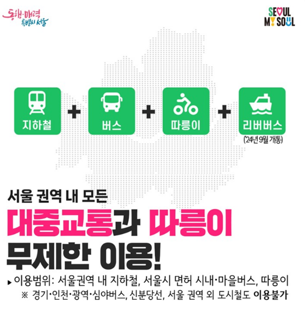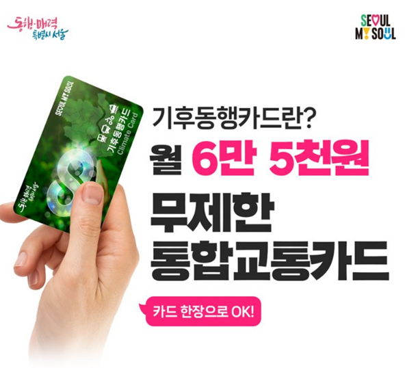 최근에 서울시에서 월 6만 5천원으로 무제한 서울대중교통 카드를 이용할 수 있는 기후동행카드 교통카드가 내년 1월 ~ 5월에 시범 판매 예정이라고 합니다.