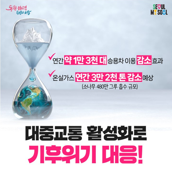 연간 약 1만 3천대의 승용차 이용을 감소시키고, 온실가스도 감소될 수 있다고 합니다. 온실가스의 규모는 연간 3만 2천 톤으로 소나무 480만 그루를 흡수한 것과 같은 양이라고 하니 정말 큰 수치가 아닐 수 없습니다.