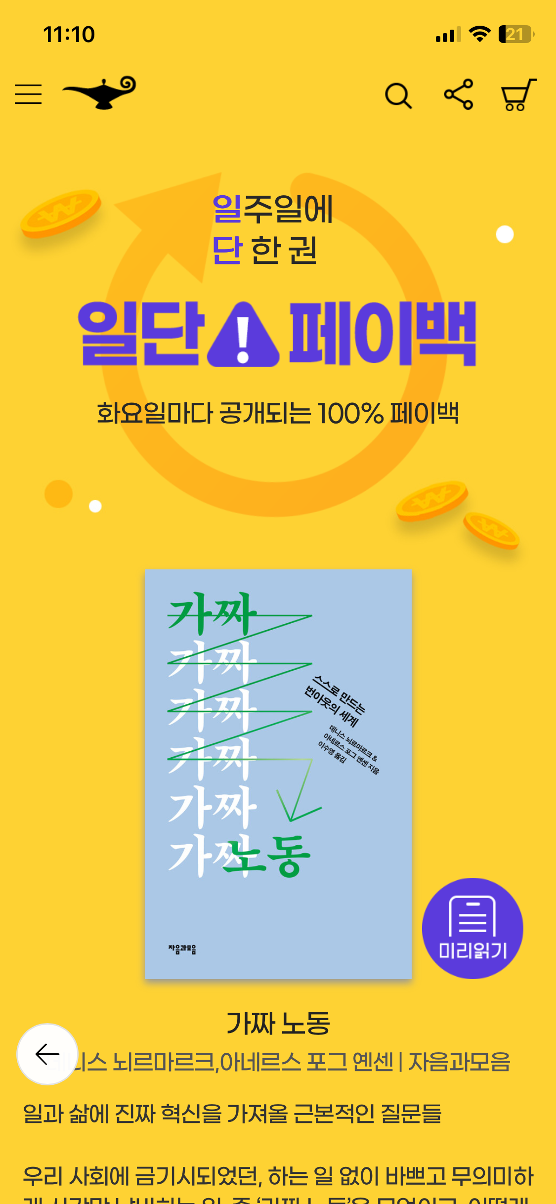 매주 화요일 대상 도서가 발표됩니다. 5,000원에 구매한 후 다시 5,000원을 돌려받는 시스템입니다. 평소에 보고 싶었던 '가짜 노동'이라는 책이 이벤트를 하고 있어서 반가운 마음에 구매했습니다.