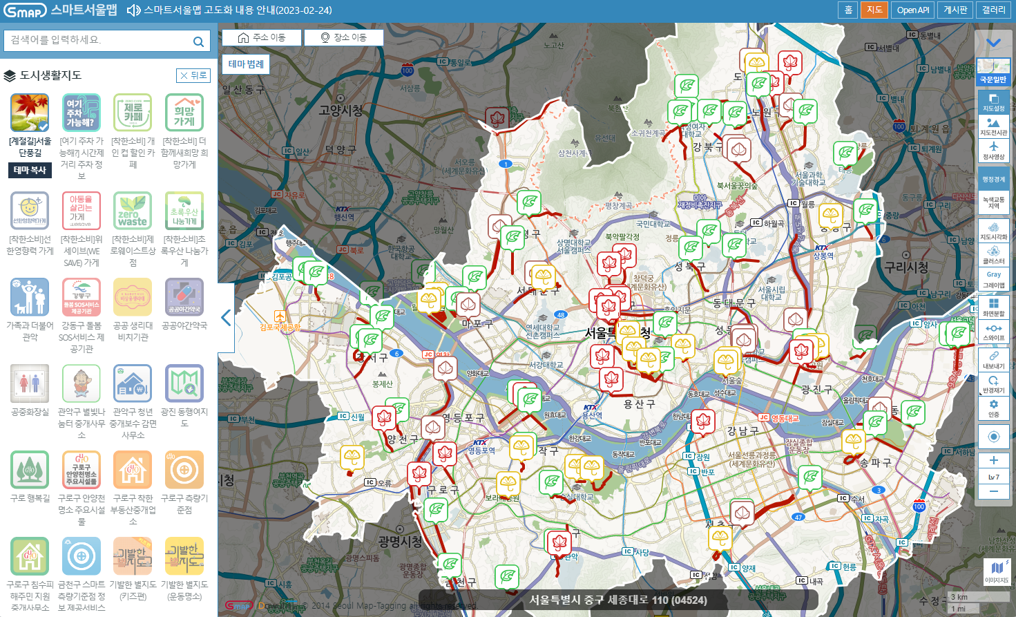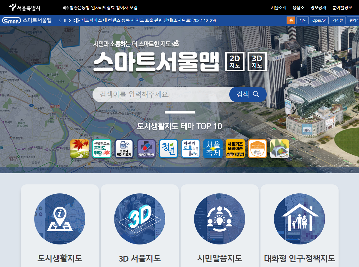 스마트서울맵은 도시생활지도, 3D 서울지도, 시민말씀지도, 코로나19 지도, 시민참여지도 등 대표 서울지도 서비스입니다.
