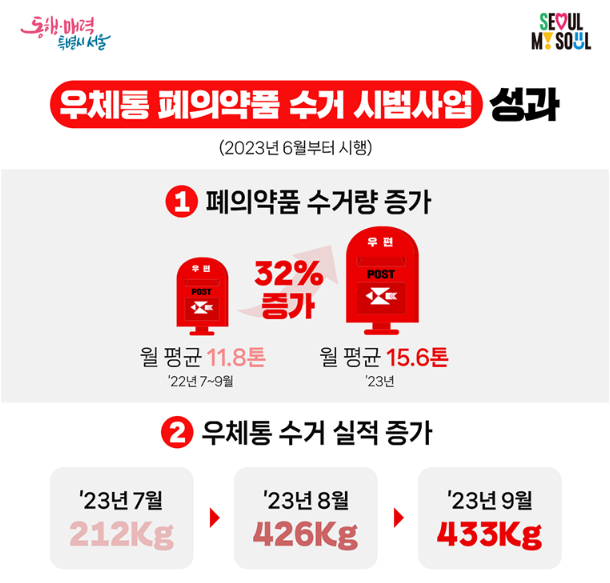 바로 주변 우체국통에 간편하게 배출하는 방법입니다. 2023년 6월부터 새롭게 시행된 수거 시범사업의 성과가 눈에 띄게 좋았다고 합니다. 2022년 대비 2023년 수거량이 약 32% 증가했고, 2023년 7월 대비 9월의 수거량은 약 두배 가량 늘었습니다.