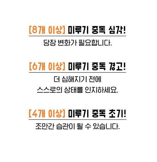 다들 몇 가지나 체크하셨나요? 저는 미루기 중독 초기가 나왔었습니다.