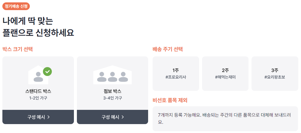 박스 크기, 배송주기, 또 (정말 싫어하는 채소가 있다면) 비선호 품목으로 제외 가능합니다. 또 선호 품목도 고를 수 있어요. 저는 요리할 때 가장 많이 쓰는 파, 양파를 선호 채소로 선택했습니다.