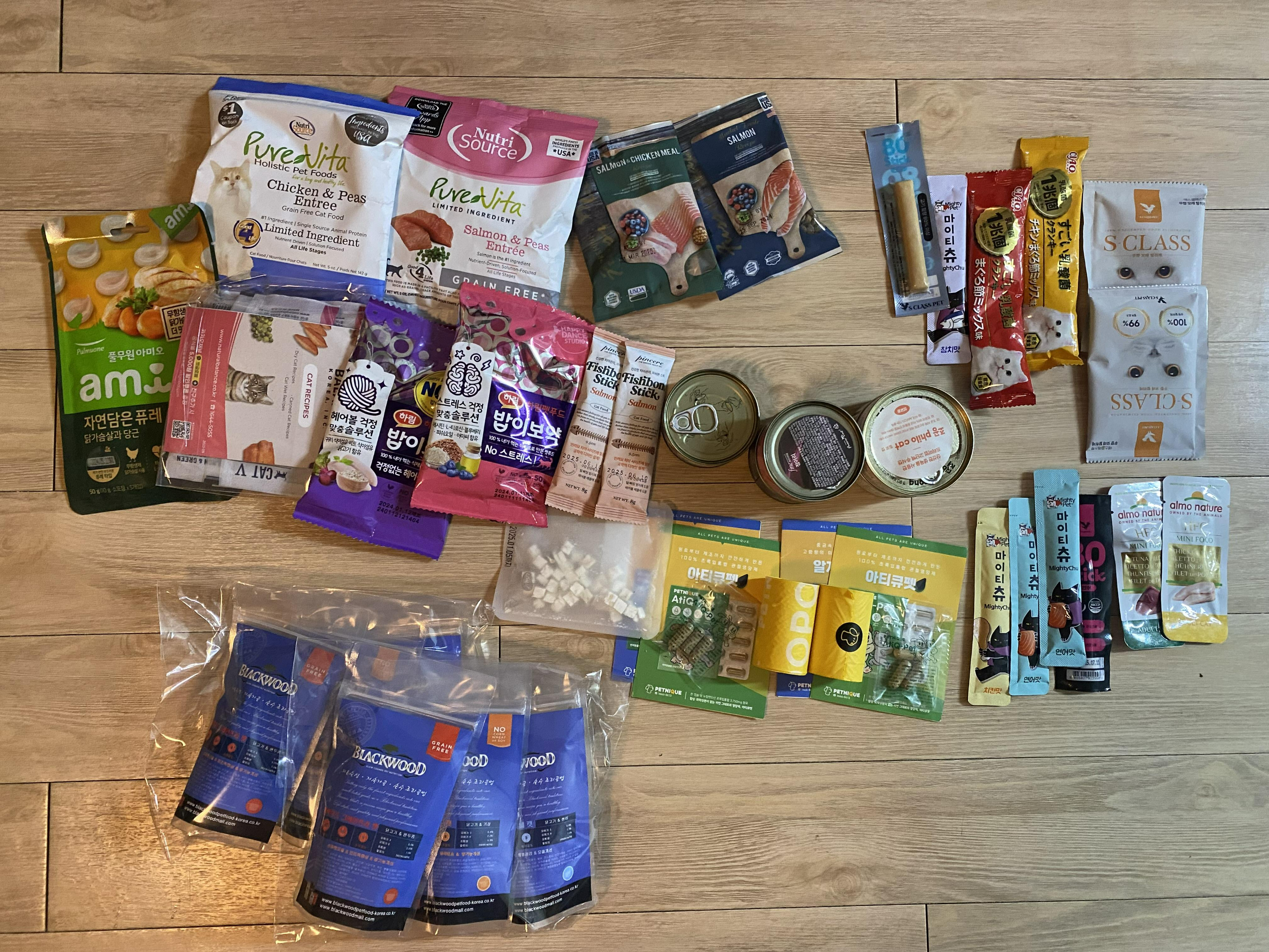 궁디팡팡에서 많이 구매를 했던 터라서, 이번에는 자제하고 꼭 필요한 것만 사자고 다짐했습니다. 이벤트들 열심히 참여해서 이렇게 구매했어요. BLACKWOOD 사료 샘플링팩 (1,000원)만 구매했습니다. (고양이 키우는 친구랑 같이 방문해서 샘플들도 두배입니다.)