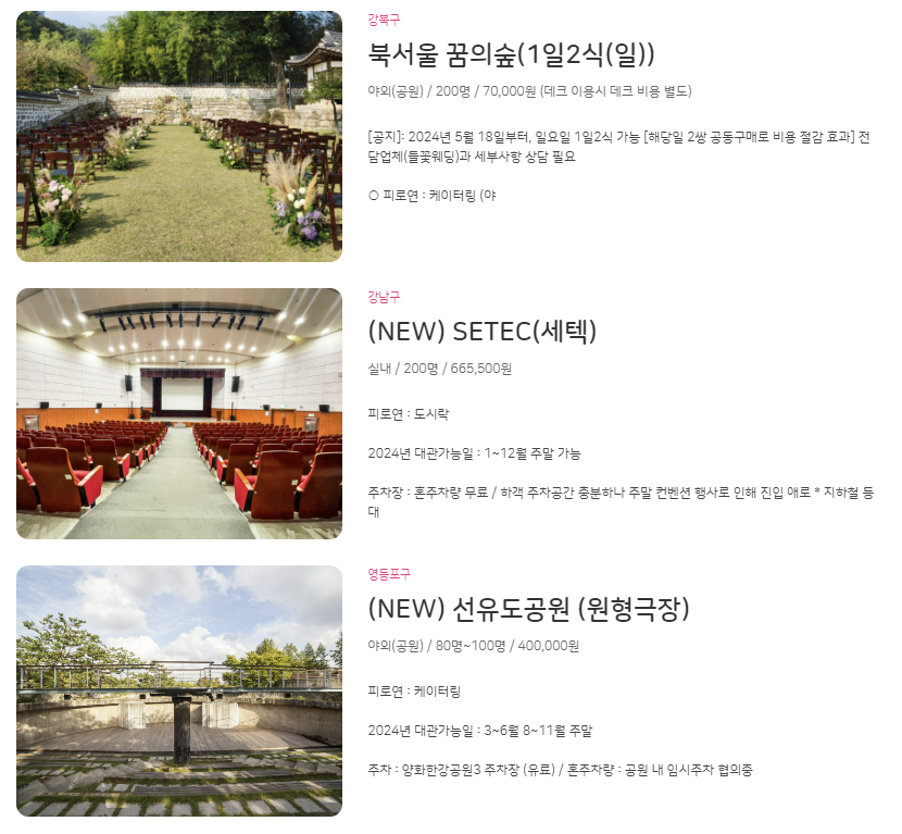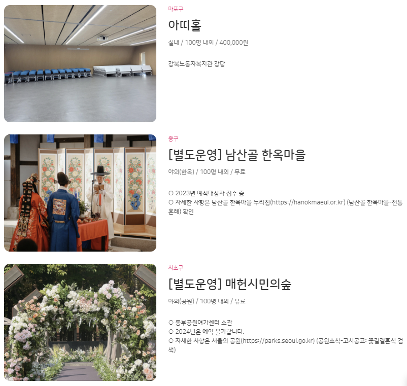 서울시 '나만의 결혼식'을 할 수 있는 장소는 28개 소가 있습니다. 공원, 한옥, 미술관, 다목적홀 등 다양한 형태의 공간을 제공하고 있습니다.