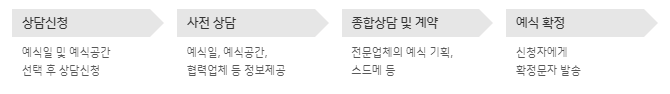 상담사와 사전상담(유선) 또는 온라인 상담(홈페이지 하단 채팅창) 후, 예식공간 별 플래너 업체와 상담을 통해서 최종 계약하게 됩니다. 여기서 꿀팁은, 인기 장소들은 예약 일정을 최대한 빨리 잡으시는 걸 추천해 드립니다.