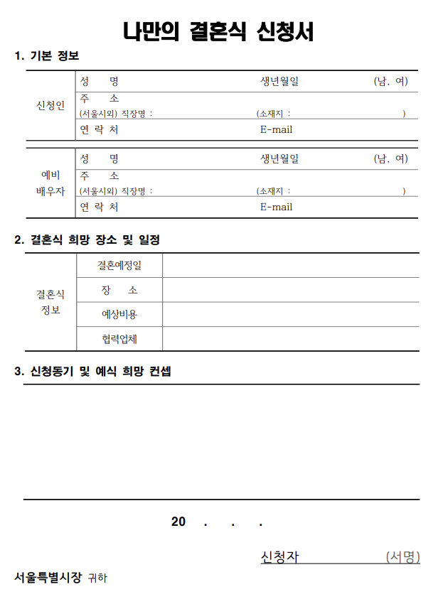 서울시민을 위해 의미있고 개성있는 결혼식을 지원하여 건강한 결혼식 문화를 조성하고자 서울시가 추진하는 '나만의 결혼식' 사업입니다.