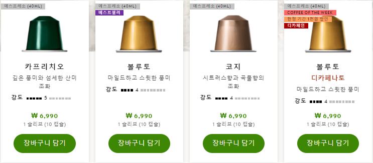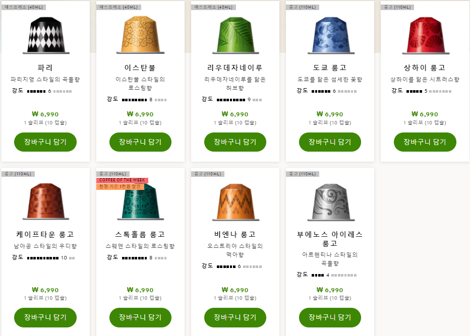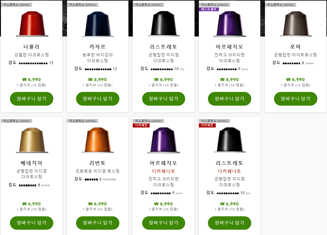 네스프레소에는 다양한 맛의 캡슐이 있어서, 항상 캡슐을 사러갈 때마다 다양하게 먹어보는 편입니다.